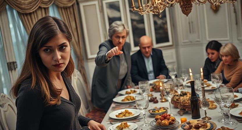 Марина замерла с бокалом в руке. Гости — родственники мужа — притихли, некоторые отводили глаза, другие с любопытством наблюдали за развитием событий. Андрей, её муж, сидел рядом и молчал, уткнувшись в тарелку.