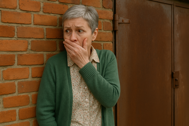Она быстро свернула к ближайшему кирпичному гаражу и укрылась за его стеной, надеясь переждать.