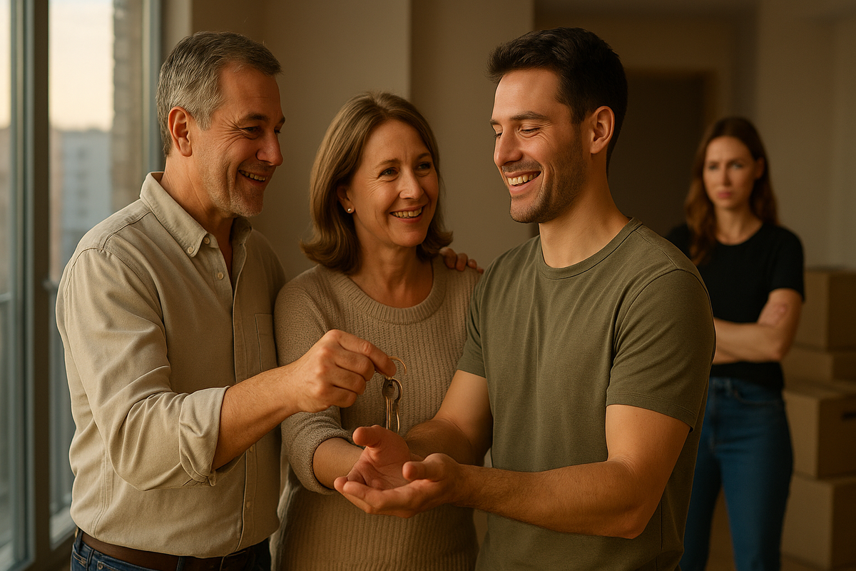 — Ключи потом, — шепнул Денис, кивая на коробочку с лентой. — Мы всё оформили. Ты рада за нас?