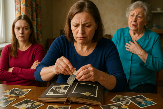 Дина отстранилась и начала методично снимать скотч с каждой фотографии. Медленно, осторожно. Её лица проступали одно за другим — серьёзная малышка, смеющаяся школьница, задумчивая подросток. Мать и сестра молча наблюдали, как она возвращает себя в семейную историю.