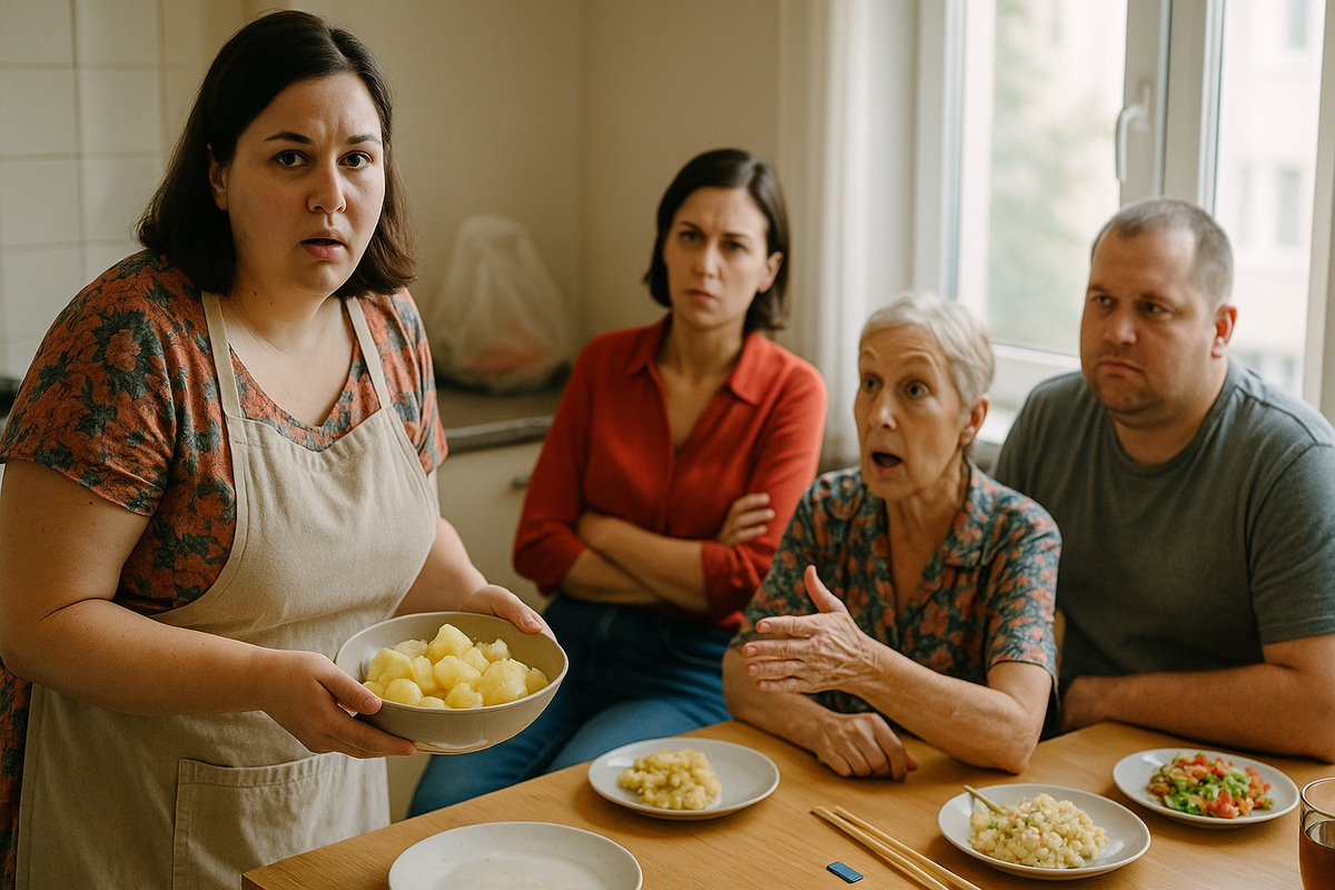 Елена сидела неподвижно, глядя то на детей, то на меню, то на кастрюлю. Золовка сначала пыталась демонстративно молчать и показывать своё недовольство происходящим, но аромат горячей картошки делал своё дело. Желудок урчал, напоминая, что последний приём пищи был давно, а принципы принципами, но кушать хочется.