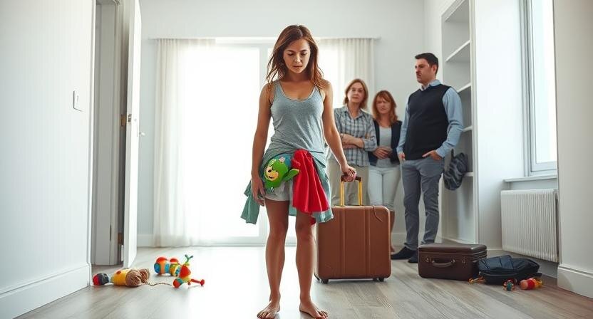 Она стояла в дверях, босая, с растрёпанными волосами, держа в руках свёрток детских игрушек. У её ног — чемоданы, торчащие в разные стороны, будто их бросили в спешке. А напротив — целая делегация: свекровь с застывшей улыбкой, брат мужа Алексей, его жена Юлия, и между ними — маленький мальчик, теребящий мамину юбку.