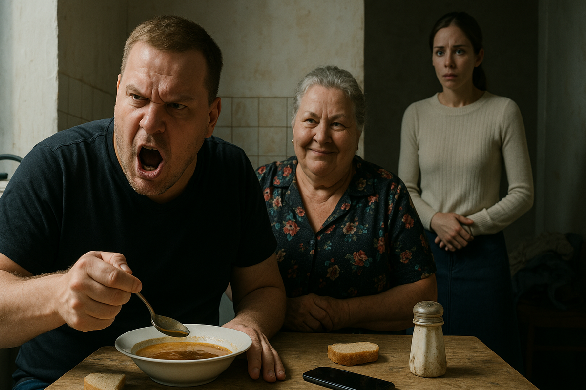 Екатерина зашла на кухню и сразу почувствовала запах горячего супа. Муж Антон сидел за столом, хлебал суп, рядом на табурете расположилась его мать Валентина Ивановна. Свекровь прихлёбывала из своей тарелки, кивала, слушала сына. Антон что-то рассказывал про работу, жестикулировал ложкой, смеялся. Валентина Ивановна поддакивала, улыбалась. Уютная семейная сцена, только Екатерину в неё никто не звал.