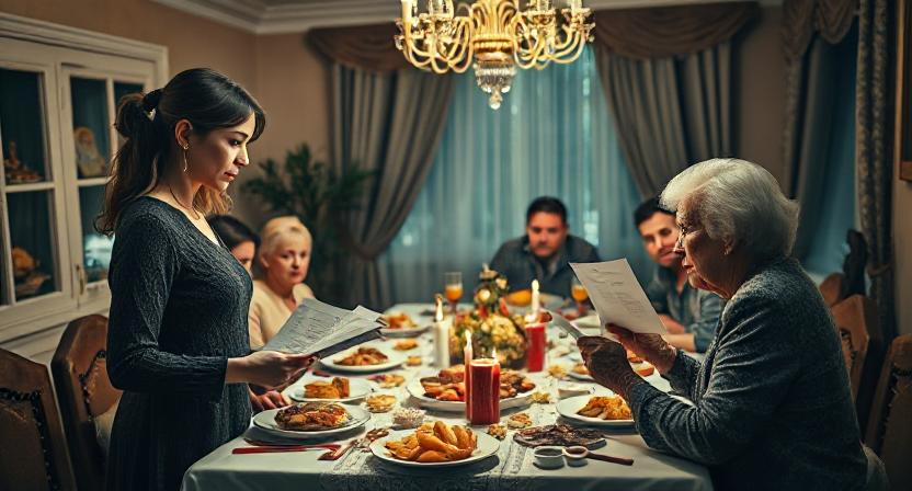 Настя медленно кивнула. Она встала из-за стола. Все смотрели на неё с недоумением. Она прошла в комнату, где лежала её сумка, достала папку с документами и вернулась обратно. Положила папку на стол перед свекровью.