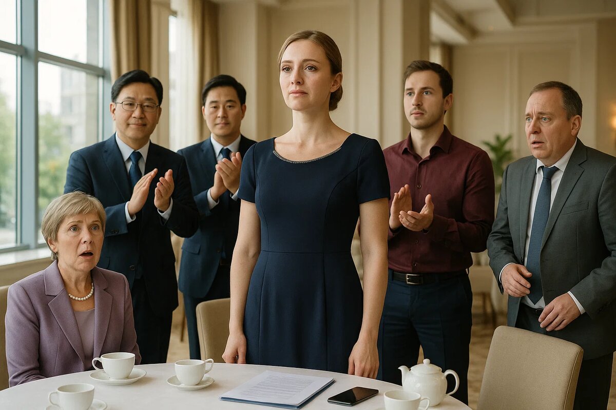 Он поклонился и вышел. Китайцы последовали за ним. Весь зал — официанты, менеджер, случайные посетители — встали и зааплодировали. Сначала тихо, потом всё громче. Кто-то кричал «браво». Господин Ли обернулся у выхода и тоже начал хлопать, глядя на Веру с уважением.
