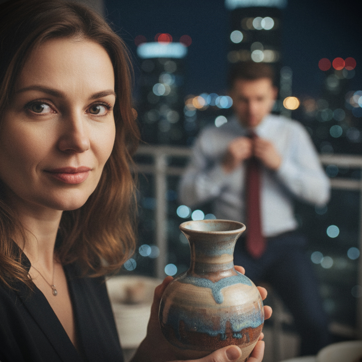 Через год они жили в крошечной съёмной однушке на окраине. Илья получил первую серьезную работу, а Лера оборудовала себе мастерскую на подоконнике. В тот вечер он ворвался в квартиру, размахивая листком бумаги — его первый проект приняли без единой правки. Подхватил её на руки, закружил по комнате, едва не смахнув с подоконника её первую удачную чашку. Опустил её на пол, подошёл к окну и взял чашку в руки.