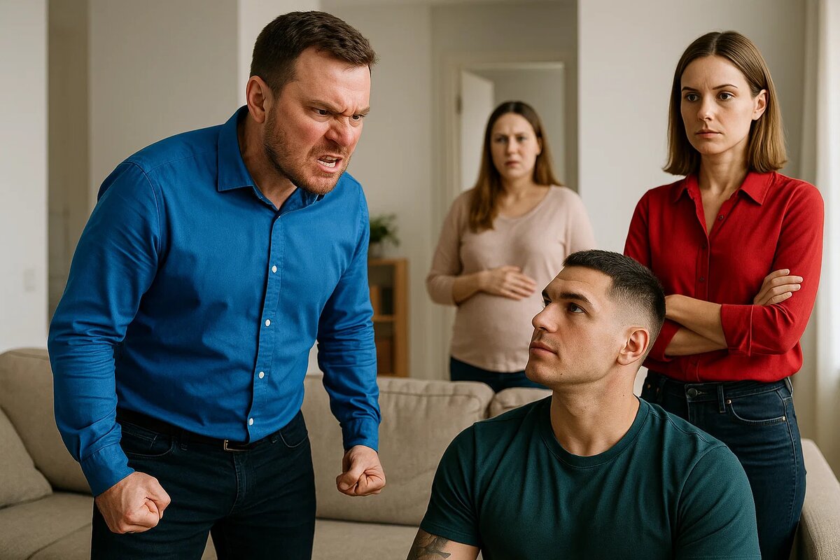 Денис прошёл в комнату — и замер. Костя сидел на диване, смотрел футбол. Денис посмотрел на Костю, потом на жену.