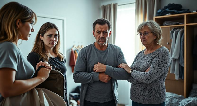 Олег появился в дверях. Он посмотрел на мать, потом на жену, на разбросанные вещи, и его лицо стало растерянным.
