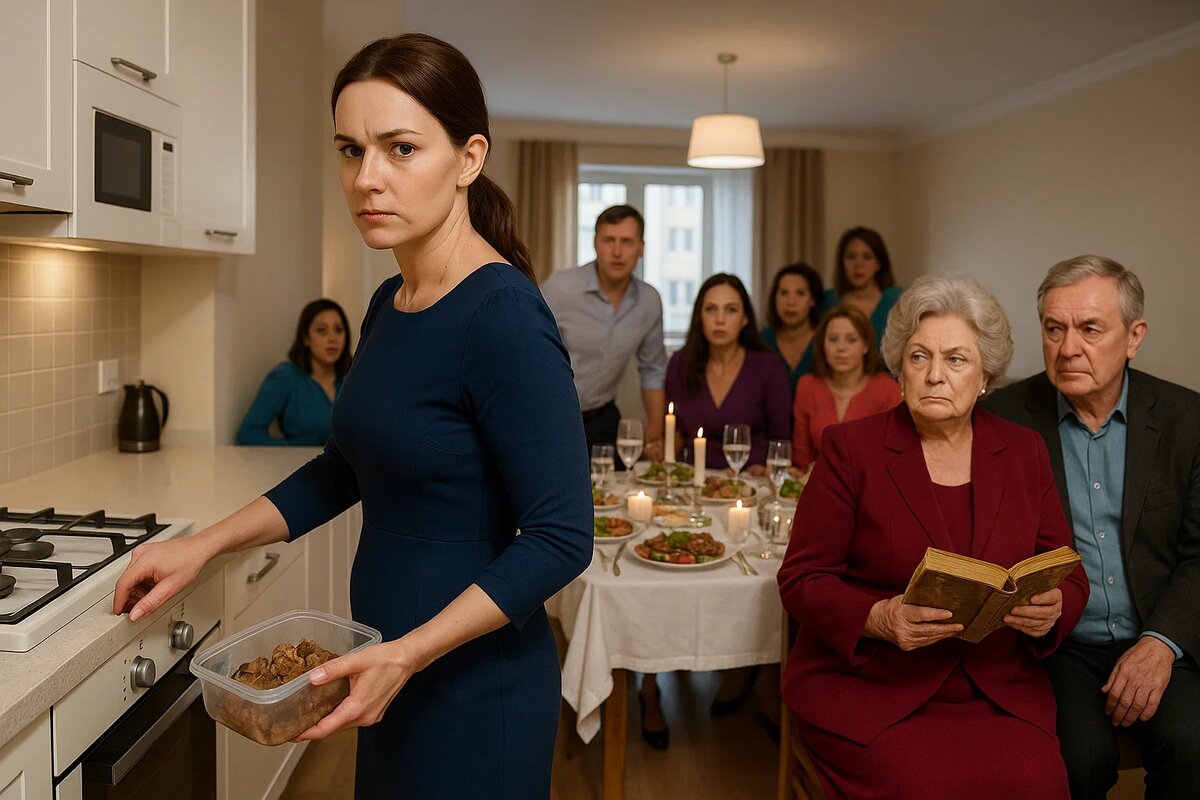 Я медленно встала. Положила книгу на стол. Прошла к плите и повернула все ручки, выключая конфорки. Главное блюдо — запечённая телятина — ещё томилось в духовке. Я выключила и её. Открыла шкаф, достала контейнеры и начала спокойно складывать блюда со стола. Салаты, закуски, нарезку. Всё, что стояло перед гостями. Руки двигались чётко, без спешки.