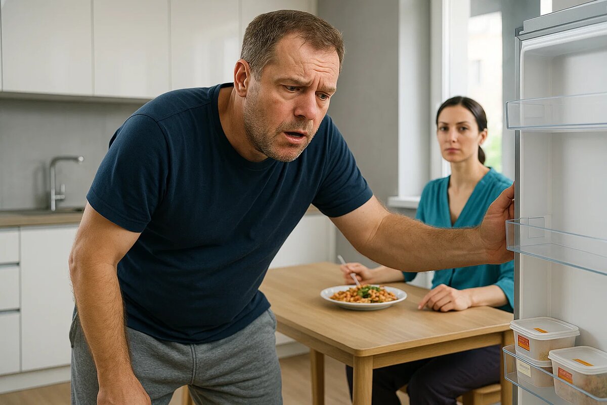 Максим распахнул дверь холодильника так, что бутылки на полке звякнули. Пусто. Три йогурта, масло, зелень в контейнере. Он открыл морозилку — там лежали аккуратно подписанные контейнеры, все с именем жены.