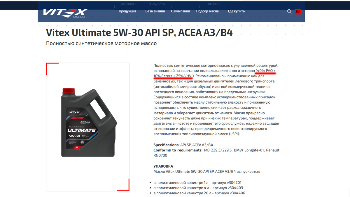 Если же взять наш пример VITAX, то здесь: — 40% PAO + 10% Esters