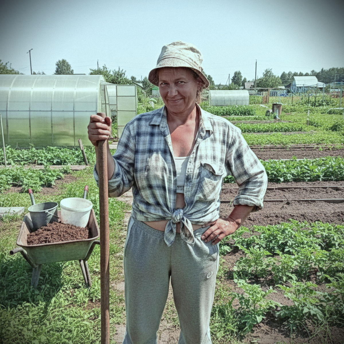 Люда вышла на крыльцо. Она была не в парадном сарафане, как ожидали гости, а в старых трениках с вытянутыми коленками, резиновых галошах и мужской рубашке, завязанной узлом на животе.