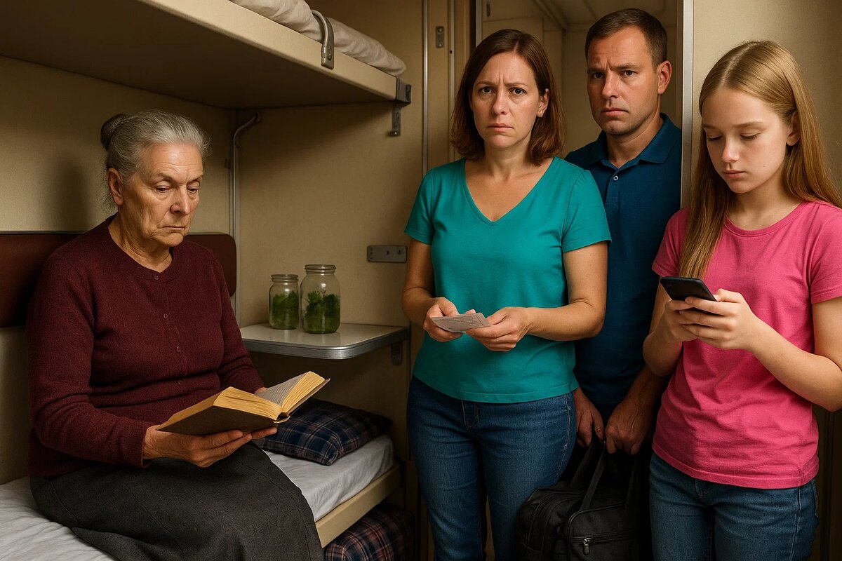 Ирина прошла в плацкарт вагона и замерла. На их нижней полке, той самой, что она выбирала за месяц до поездки, сидела пожилая женщина с лицом, будто высеченным из камня. Под полкой громоздились клетчатые сумки, перевязанные верёвкой. На столике между двух банок с зелёными соленьями в мутной воде лежала раскрытая книга.