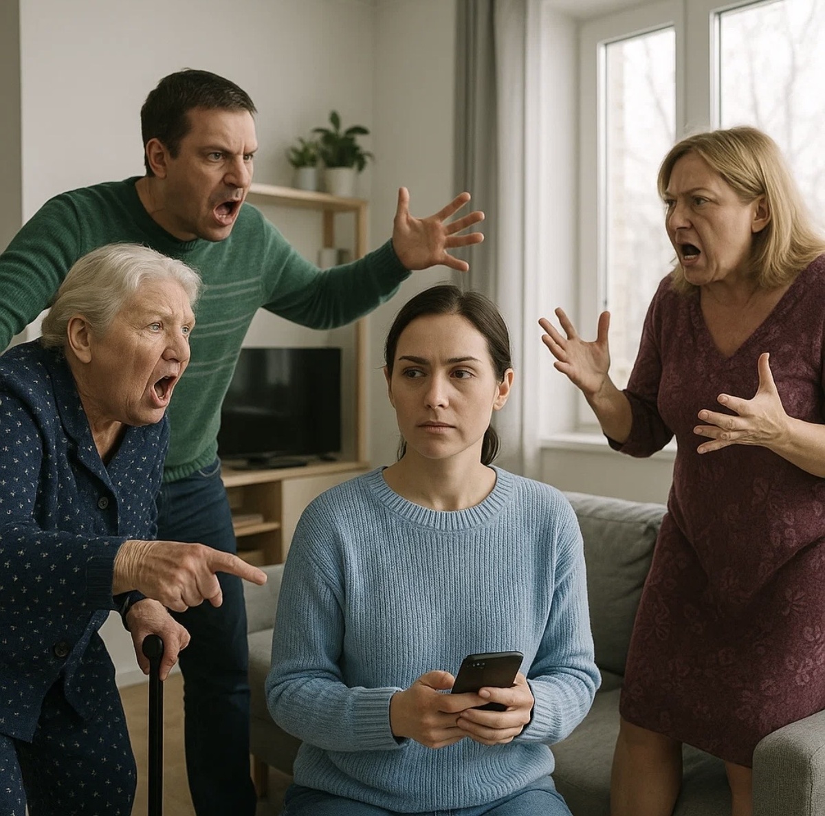 Ольга вышла в зал. Все трое сидели на диване — Клавдия Петровна посередине, Жанна и Геннадий по бокам, как свита. Телевизор работал, но никто не смотрел. Все уставились на неё.