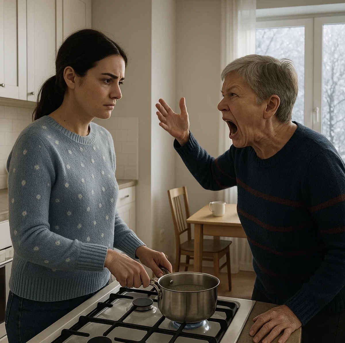 Снег за окном падал крупными хлопьями, оседая на подоконнике белой шапкой. Ира стояла у плиты, сжав в руках половник, и смотрела на свекровь, которая ворвалась в квартиру без звонка — своими ключами, как всегда. Щёки у той пылали от мороза и праведного гнева, пуховый платок съехал набок, серые волосы растрепались.