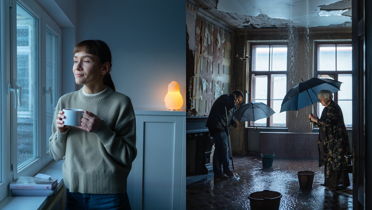 Первый этаж, где жила свекровь (и где мы планировали временно ютиться на раскладушках во время стройки), начало заливать. Вода текла по стенам ручьями, капала с люстр (свет пришлось отключить, чтобы не замкнуло). Обои отклеивались пластами, штукатурка вздувалась пузырями, мебель накрыли пленкой, но сырость была жуткая.