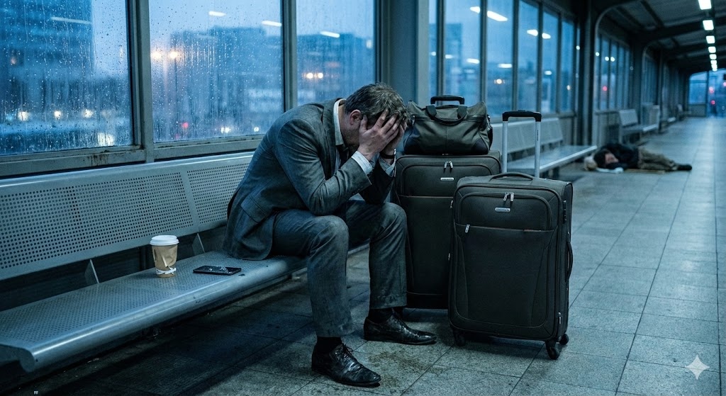 Олегу нужно было на работу. К 9:00. В офис, где он был «уважаемым человеком». Но сейчас он понимал, что не может туда пойти. Не в мятом костюме, не с запахом вокзала, не с чемоданами. А главное — он не знал, куда идти после работы.