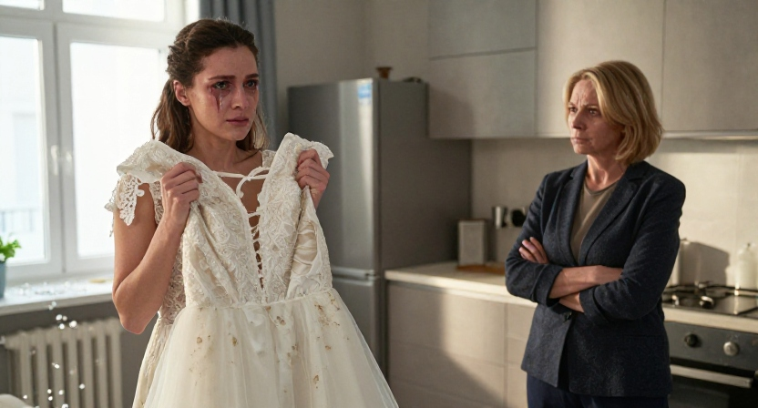 Она аккуратно положила испорченное платье на стол. Прямо на чистую скатерть, которую свекровь постелила сегодня утром. Следы грязи отпечатались на белой ткани.