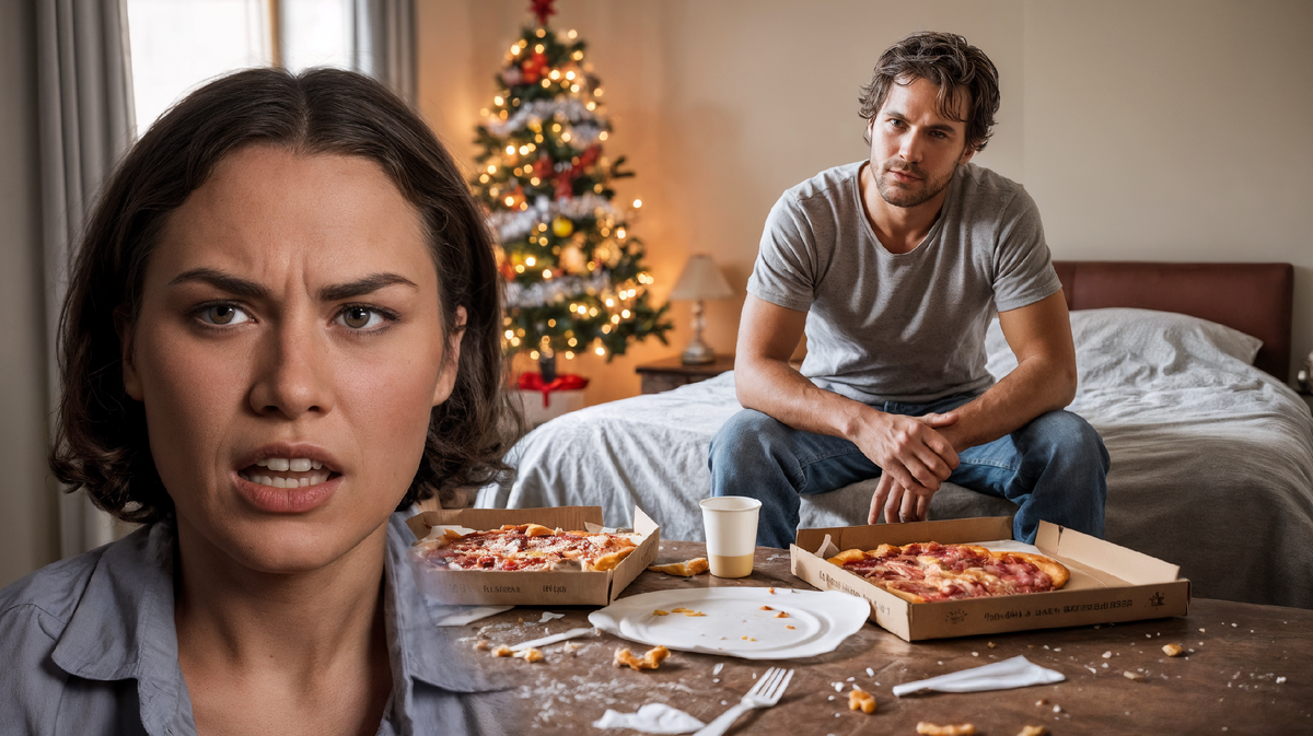 Инесса обернулась от раковины и увидела в проеме двери мужа. Сергей сидел на кровати, растрёпанный, в мятой футболке. Вокруг него валялись пустые коробки из-под доставки еды. На полу — носки. На столе — разлитый кетчуп.
