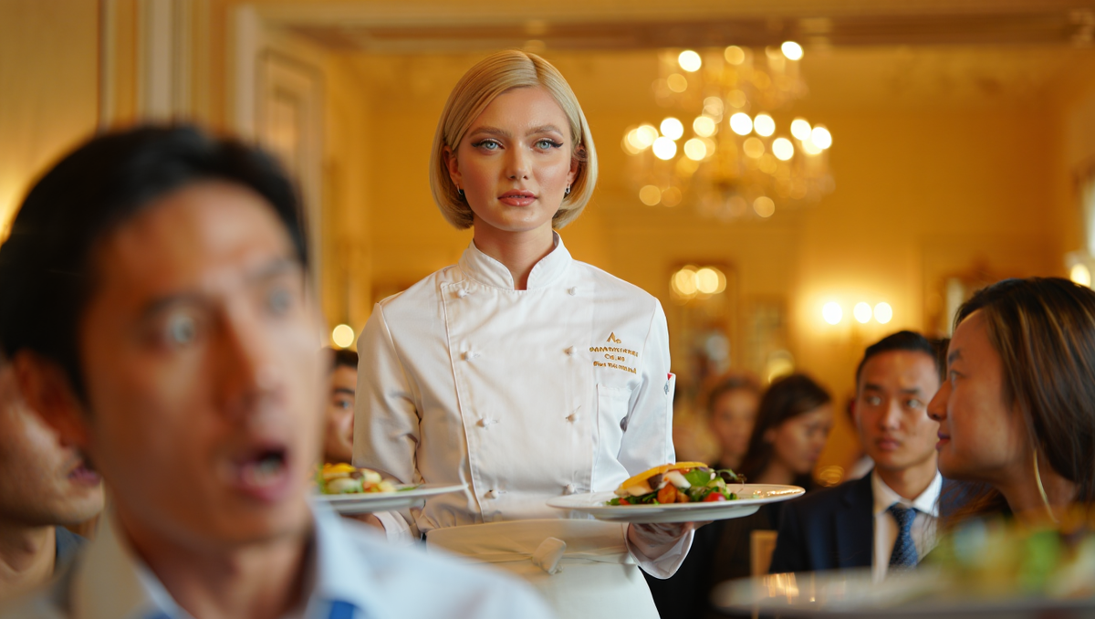В зал из кухни вышла женщина. Высокая, стройная, в белоснежном кителе с вышитым золотом логотипом «V». С легкой, уверенной улыбкой. Стрижка каре, стильный макияж.