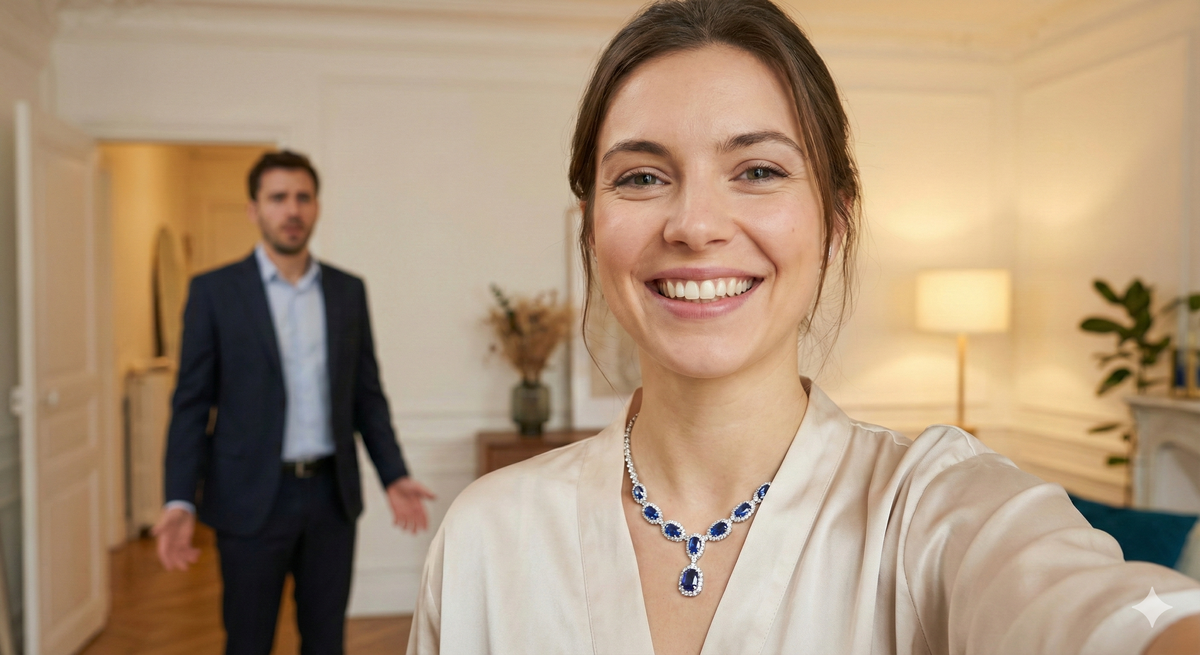 Внутри, на белой шелковой подушечке, сияло колье. Это была не бижутерия. Лена, хоть и не была экспертом, сразу поняла: это белое золото и бриллианты. Тонкая, изящная работа. В центре композиции сверкал крупный сапфир в форме капли. Вещь стоила целое состояние. Уж точно больше, чем три месячных зарплаты Вадима, о которых он ей постоянно ныл.