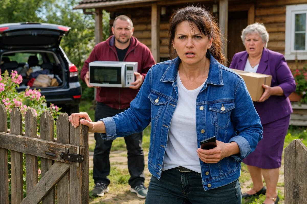 На крыльце стояла Зинаида Фёдоровна с коробкой в руках. Денис выносил из дома микроволновку.