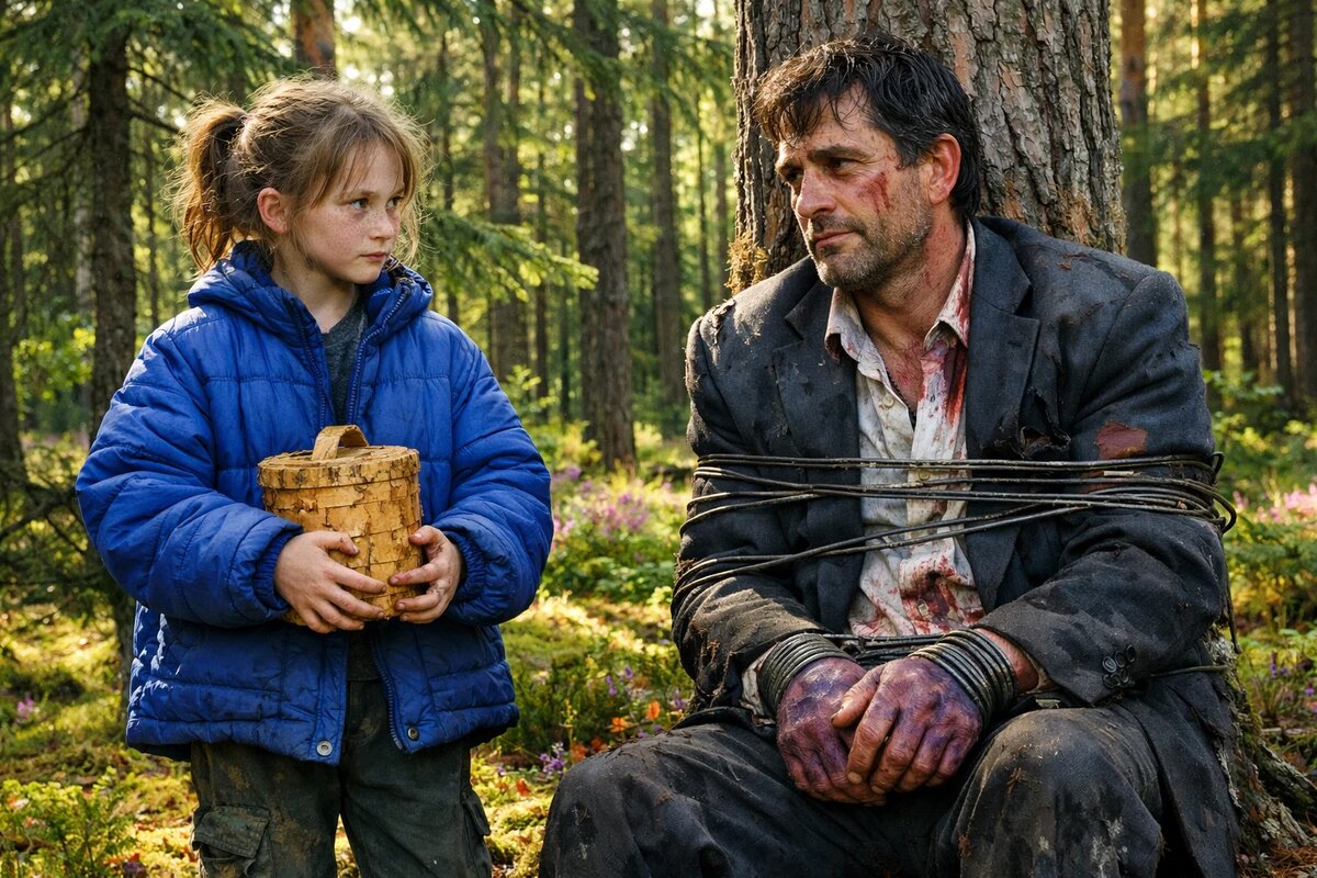 Стон услышала у ельника. Звук чужой, не лесной. Она замерла. Дед говорил всегда: «Человек в лесу опаснее медведя». Подкралась бесшумно и увидела мужика, привязанного к сосне стальной проволокой. Руки синие, лицо — месиво. Пиджак дорогой, но порванный. Ботинки городские, для леса не годятся.