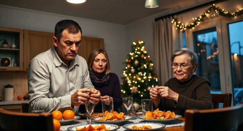 Вера медленно подняла голову. В руках у неё был апельсин — кожура уже снята наполовину, пальцы липкие от сока. На плите остывал чайник, из комнаты доносился голос ведущего с телевизора, обещавшего небывалые акции к праздникам. За окном, на соседнем доме, моргали огоньки — дешёвая гирлянда, но настойчивая, как реклама.
