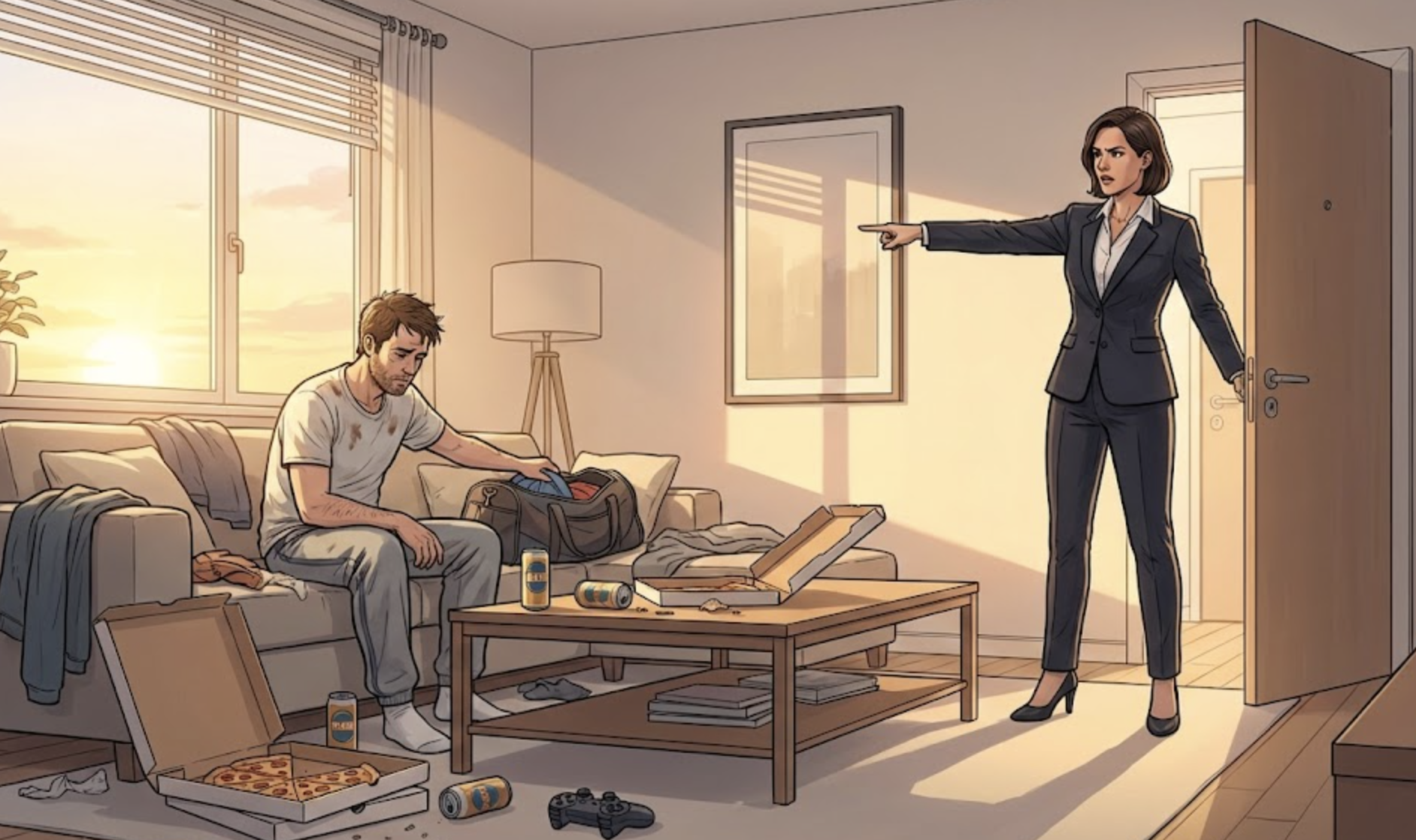 — А я не хочу жить с тунеядцем! — отрезала она. — У тебя час на сборы. Если через час ты будешь здесь, я вызываю полицию и говорю, что посторонний мужчина отказывается покидать мою квартиру.