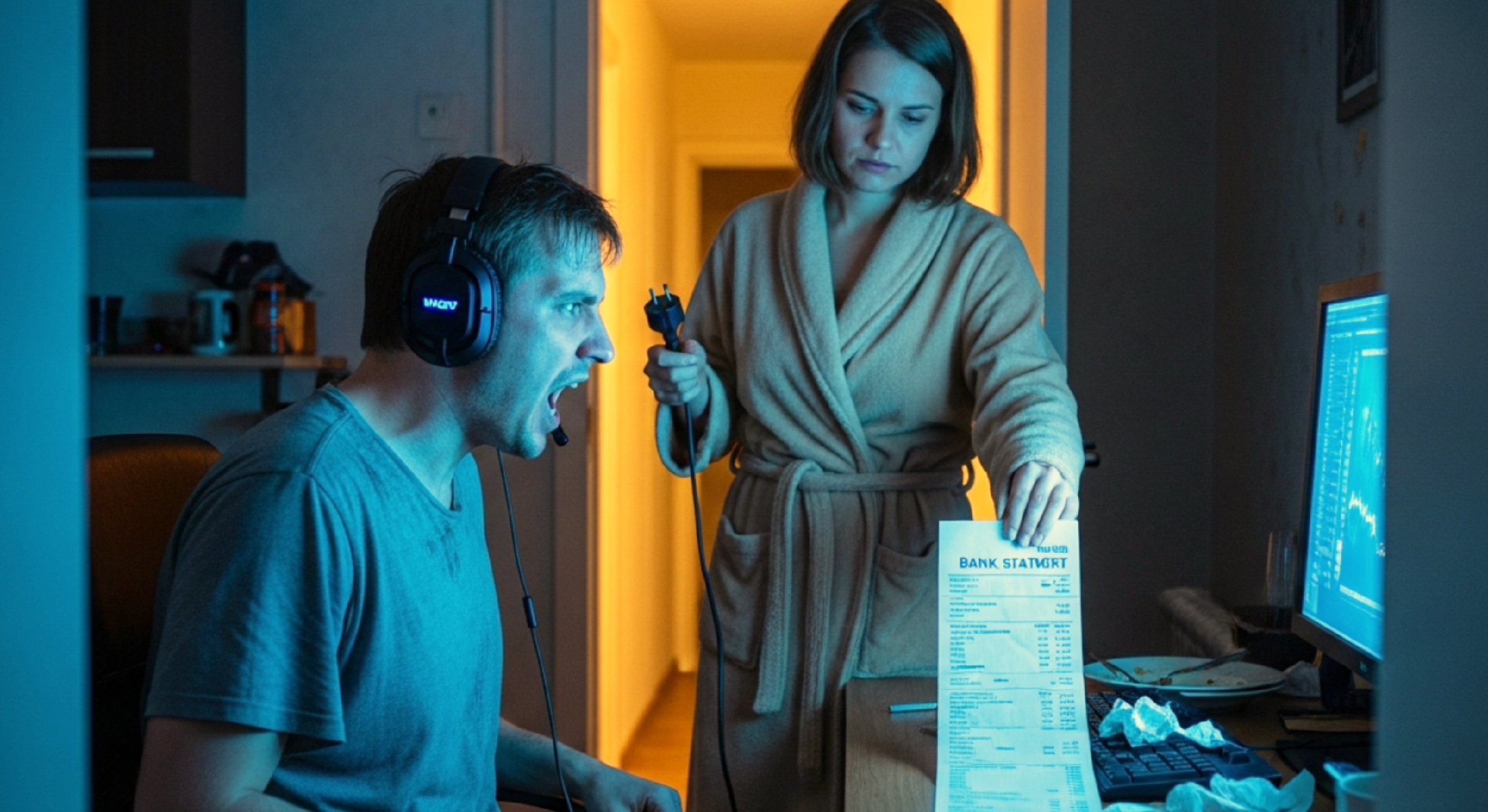 В комнате мигал монитор, Виктор сидел спиной к двери, в продавленном компьютерном кресле. На голове массивные игровые наушники, которые он купил с кредитки месяц назад, «Алин, ну звук — это же погружение!». Правая рука судорожно дёргала мышкой, левая нога отбивала нервную дробь по паркету. Тряслась так, будто у него припадок.