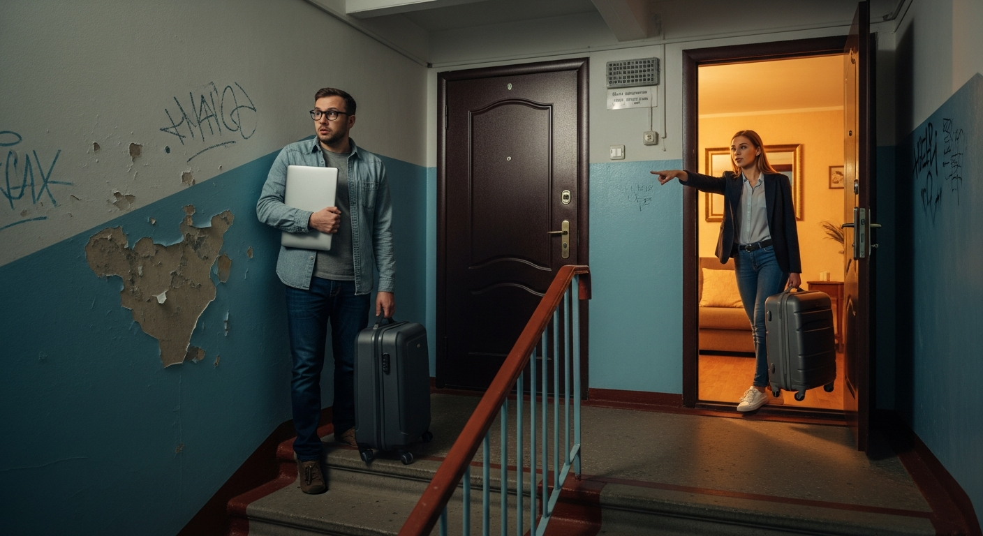 Виктор оказался на лестничной клетке. Растерянный, с чемоданом и ноутбуком под мышкой.