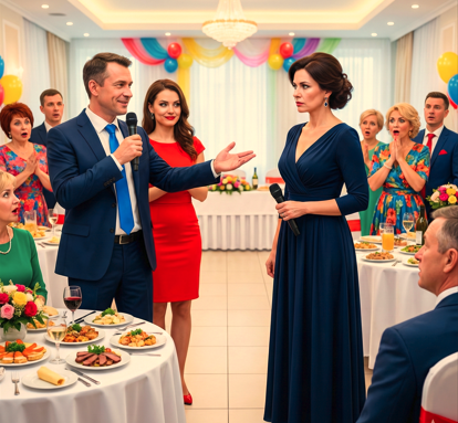 Когда музыканты сделали перерыв, в зале повисла уютная тишина, нарушаемая лишь звоном бокалов. Виталий, разгоряченный крепким, встал, чтобы произнести ответную речь. Но вместо благодарности гостям его потянуло на откровения. Он обнял Кристину за плечи — якобы по-дружески — и громко, на весь зал, произнес, кивнув в сторону жены: