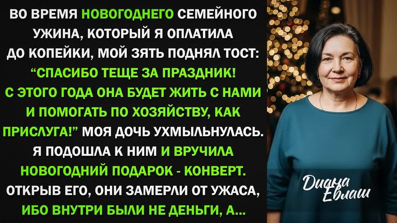 — Спасибо вам за этот вечер! — продолжал зять, и в его глазах блеснул недобрый огонек. — Но это еще не всё. У меня для вас всех потрясающая новость. Мы с Леночкой приняли важное решение. С нового года, то есть буквально с завтрашнего дня, наша любимая теща переезжает жить к нам!