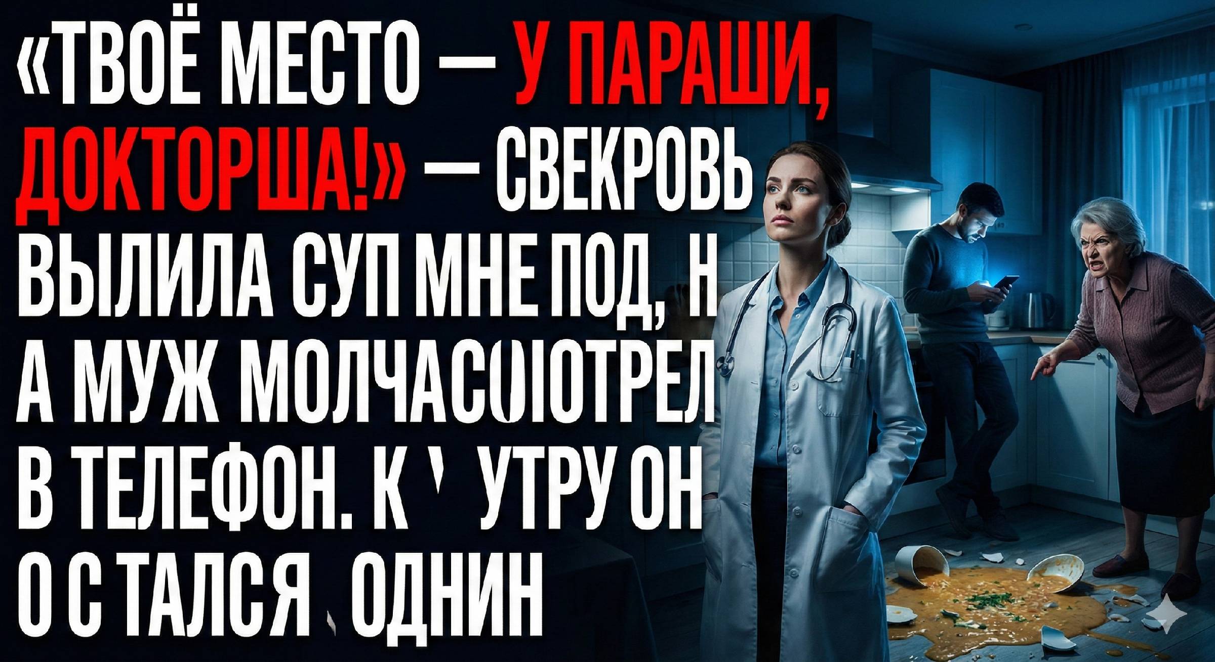 «Твоё место — у параши, докторша!» — свекровь вылила суп мне под ноги, а муж молча смотрел в телефон. К утру он остался один