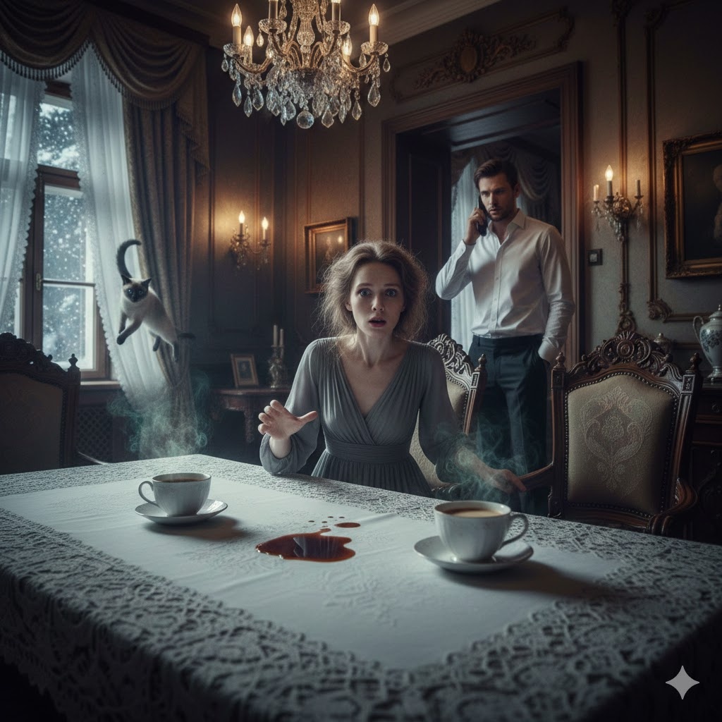 Катя замерла, похолодев. Она смотрела, как свекровь пытается что-то сказать, но из её рта вырывался лишь клокочущий звук. Старая женщина повалилась набок, увлекая за собой чашку. Остатки кофе с запахом горького миндаля медленно растекались по белоснежной скатерти темным, зловещим пятном.