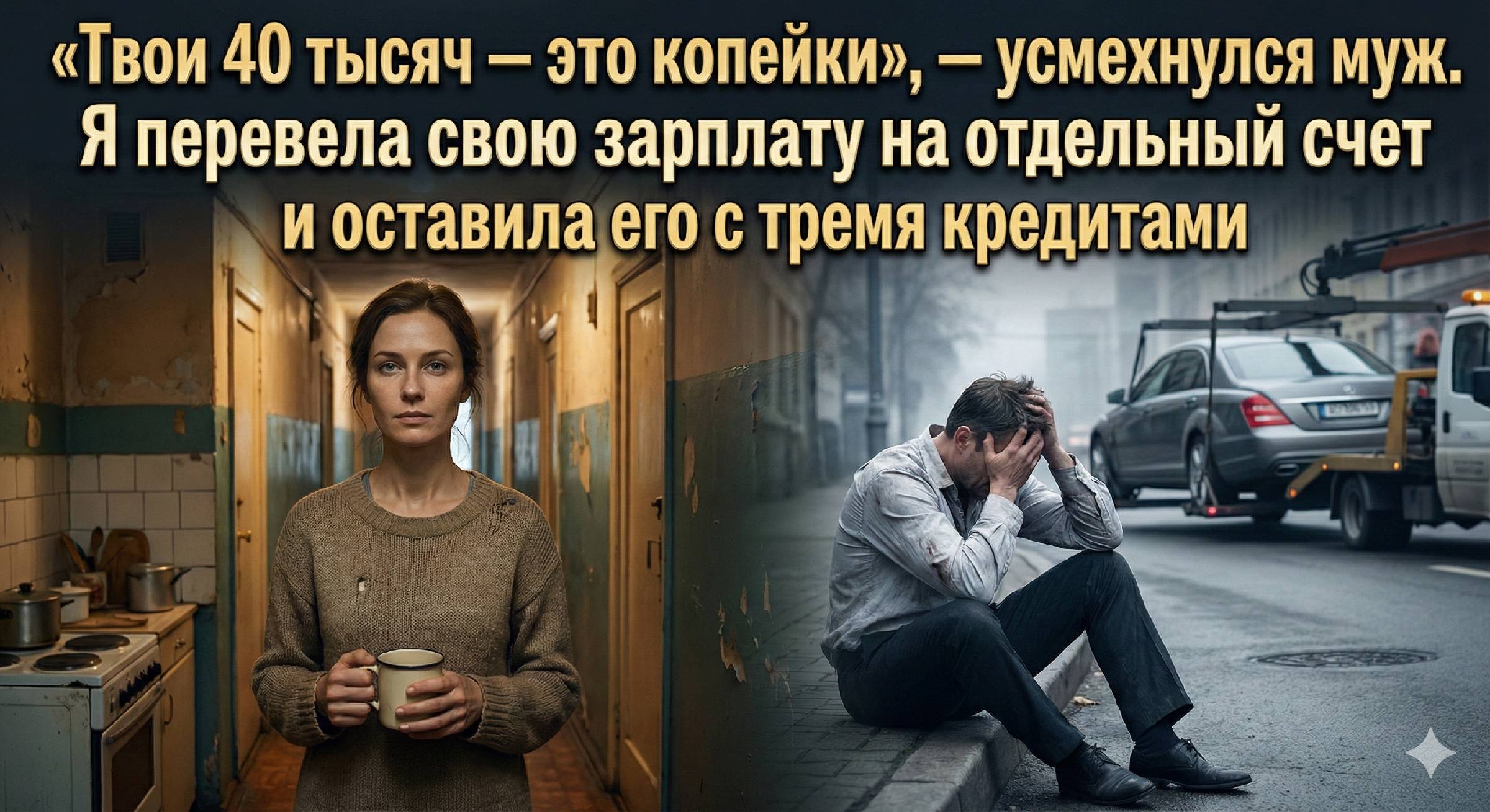 — Виталий, — сказала я, и мой голос прозвучал удивительно чужим. — Машину забирают за твои долги. У меня нет сорока тысяч для тебя. У меня есть сорок тысяч на месяц жизни для меня и двоих детей. Прощай.