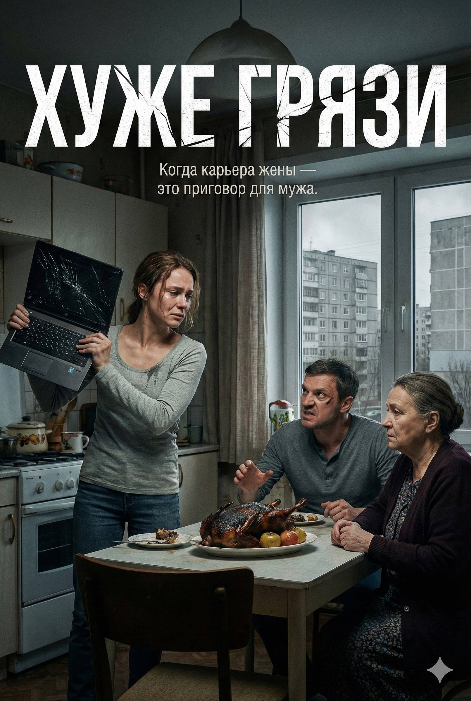 Я отключилась, глядя в тёмное окно. В стекле отражалась женщина с растрёпанными волосами, в домашнем фартуке поверх брюк. Женщина, которая только что выгнала мужа, потеряла рабочий инструмент перед главным проектом года и осталась одна с двумя детьми.
