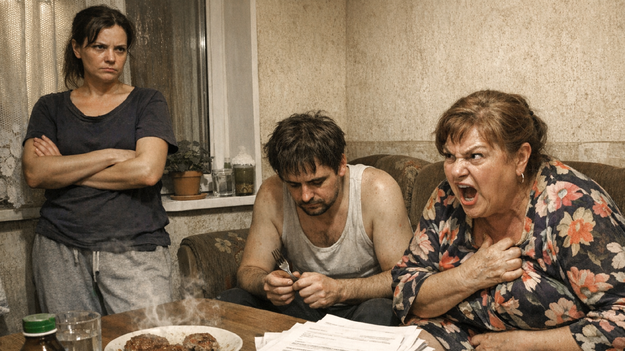 Семейный совет собрали на кухне, Алексей ел котлеты, Анна сидела напротив, свекровь царила во главе стола.