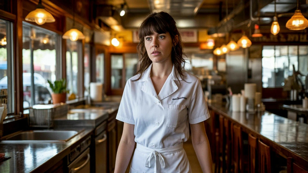 Дверь в кухню, та самая, что разделяла блестящий мир гурманов и жаркий, шумный ад творения, распахнулась с лязгом. Оттуда вышла она. Мария. В простом белом хлопковом платье, поверх которого был надет уже поблёкший фартук. На руках до локтей — следы моющего средства, волосы, тёмные и слегка вьющиеся, были убраны под небрежно надетую сеточку. Она несла пустой поднос для грязной посуды и на мгновение остановилась, оценивая обстановку.