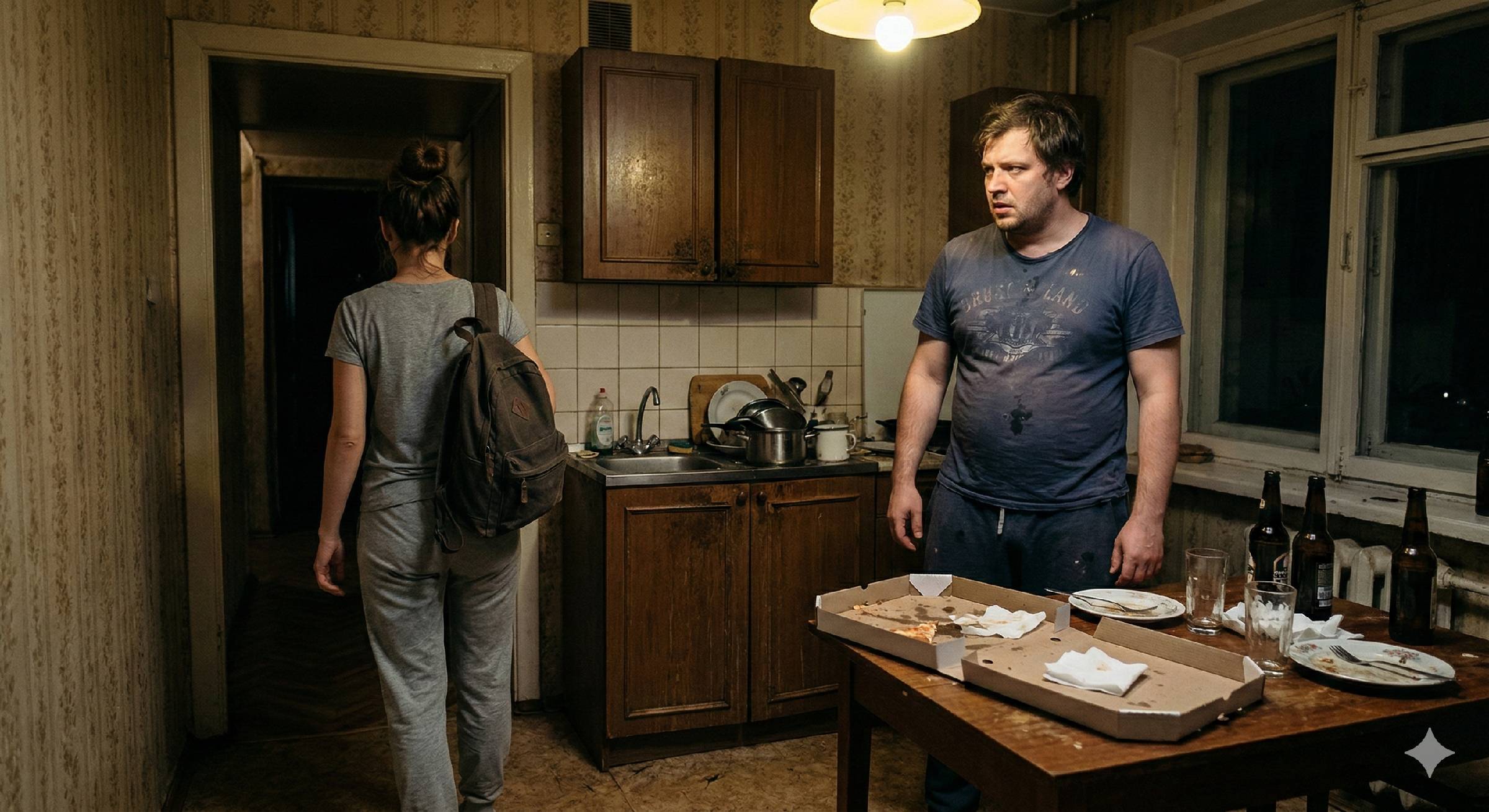 За круглым столом на нашей съёмной кухне в Нижнем сидели трое его друзей. Илья, Костя и Макс. На часах было десять вечера пятницы. В воздухе плотно висел запах чесночного соуса, дешёвой колбасы из доставки и перегара. Я только что вышла из спальни, где девять часов подряд доделывала чертежи для заказчика — я дизайнер интерьеров, сроки по проекту гостиной горели. Вышла просто налить себе стакан воды.