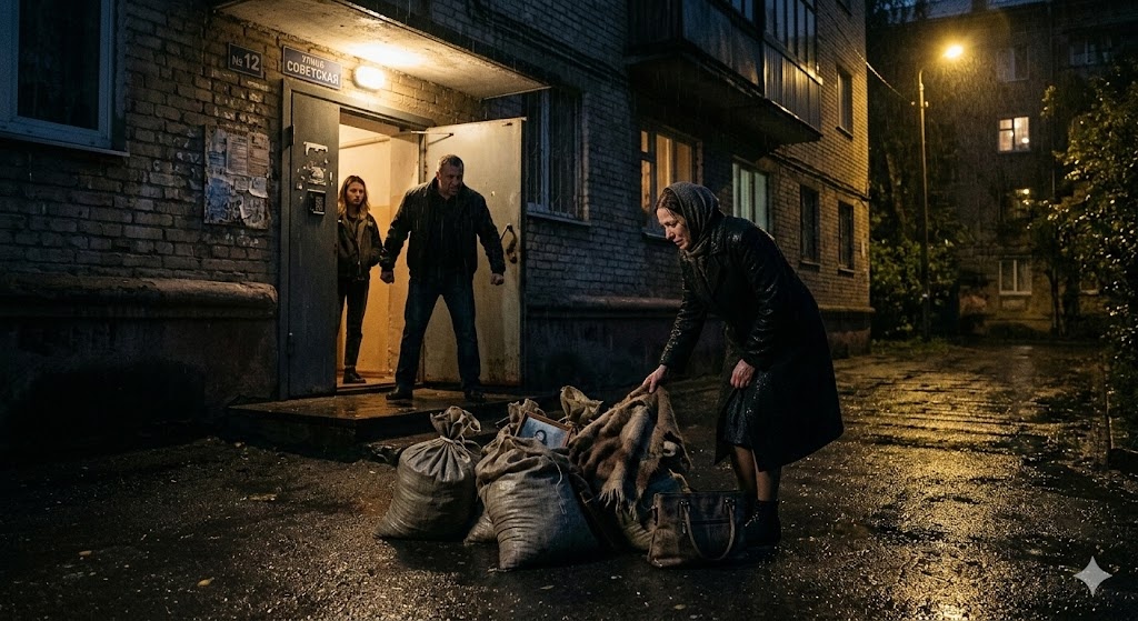 Но у подъезда она заметила неладное. На мокром асфальте, прямо под козырьком, стояли огромные строительные мешки, набитые чем-то бесформенным. Из одного из них выглядывал край её любимого вязаного пледа — того самого, что она расшивала долгими зимними вечерами.