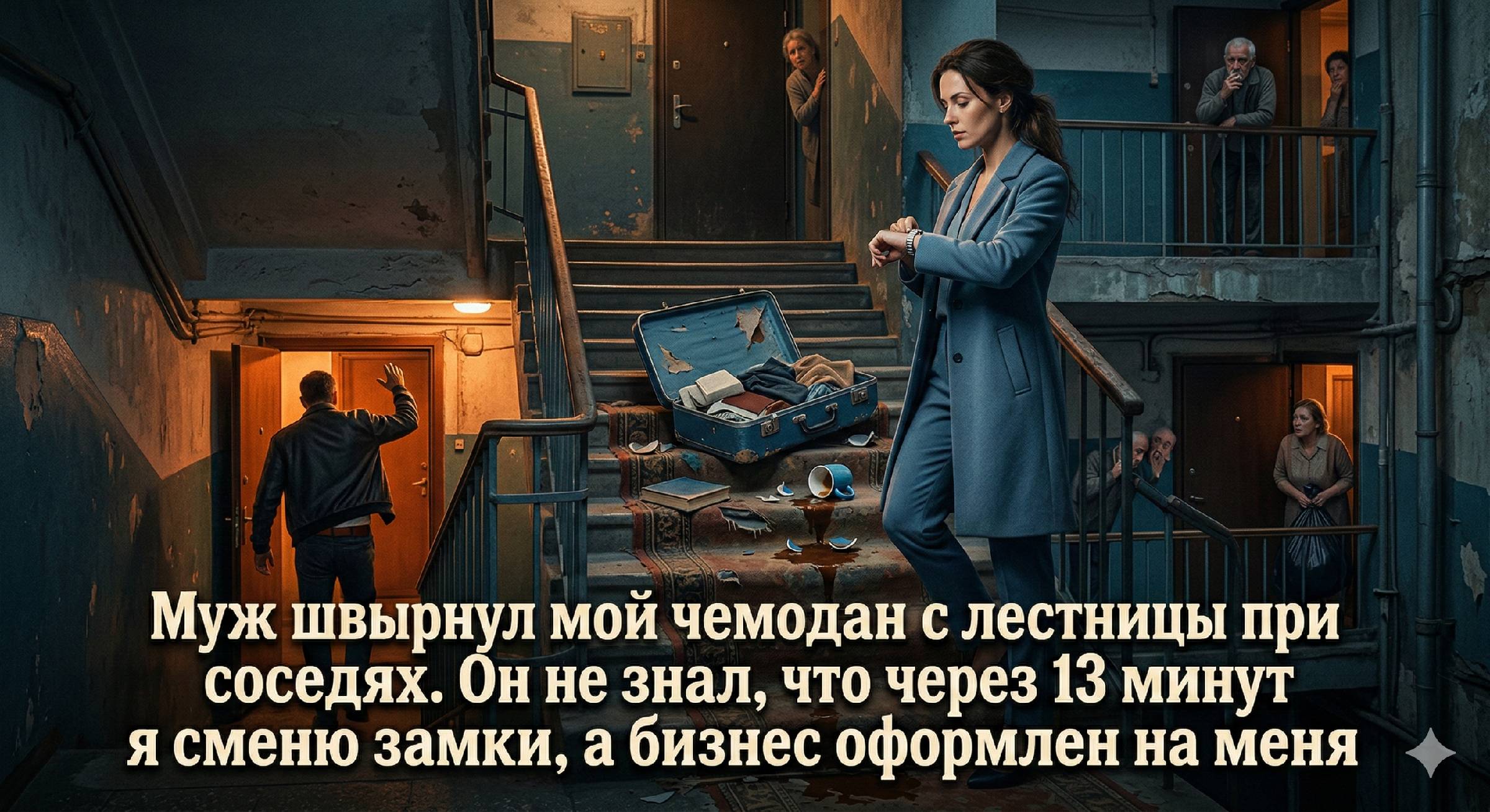 Муж швырнул мой чемодан с лестницы при соседях. Он не знал, что через 13 минут я сменю замки, а бизнес оформлен на меня