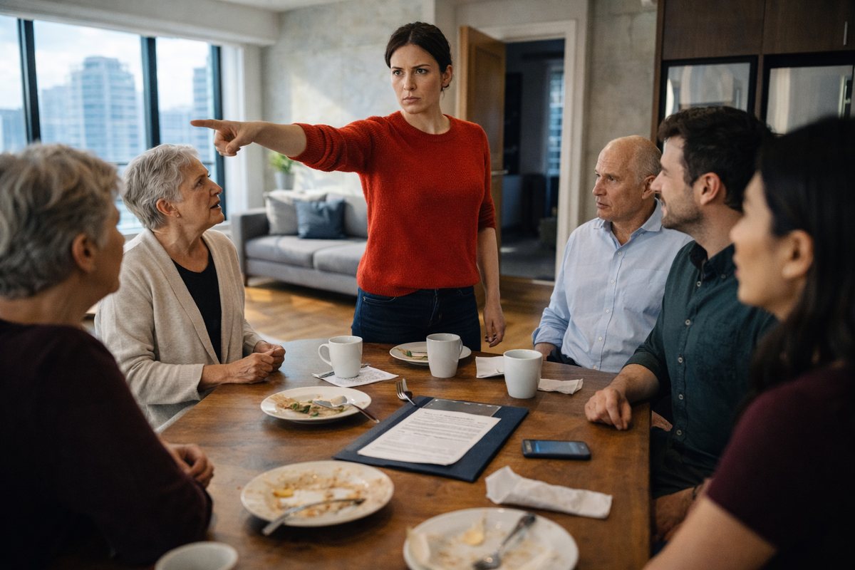 Лидия Николаевна резко встала из-за стола, тяжело дыша и хватаясь рукой за спинку стула. Лицо её налилось краской. Она схватила сумку, висевшую на спинке стула, и направилась к выходу, громко топая каблуками по паркету. Виктор Степанович молча последовал за ней, виновато опустив голову. У двери свекровь резко обернулась.