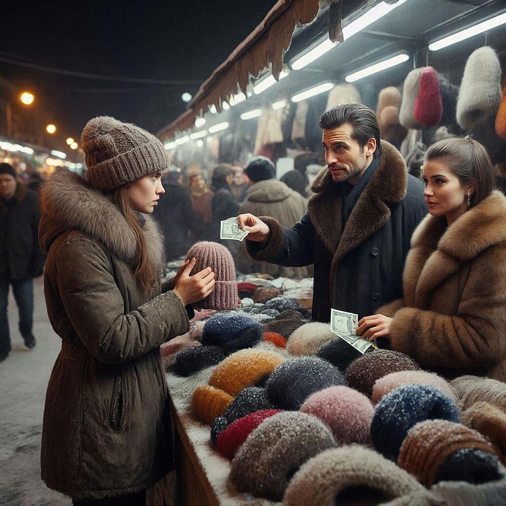 Он остановился в двух шагах, разглядывая мои шапки с таким видом, будто это не товар, а куча мусора. Девушка в шубе встала чуть поодаль, брезгливо оглядываясь по сторонам.