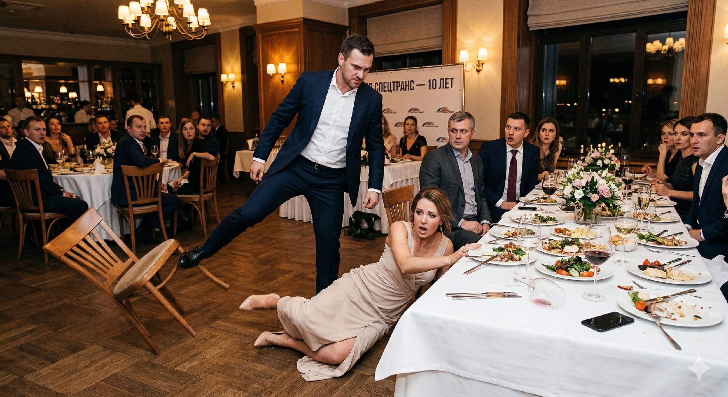 Я рухнула. Некрасиво, боком, задев локтем край стола. Вилка упала мне на колено, оставив жирный след от соуса на светлом платье. В зале ресторана, где «СпецТранс» отмечал десятилетие, стало так тихо, что я услышала, как на кухне звякнула кастрюля.
