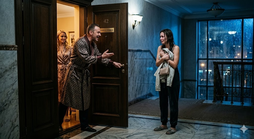 Его слова ударили наотмашь, больнее, чем пощечина. Я стояла на лестничной клетке элитного дома, прижимая к груди единственное, что успела схватить — легкую куртку и сумочку с документами. На мне были домашние велюровые брюки и тапочки. За окном в подъезде завывал холодный ноябрьский ветер, швыряя в стекло пригоршни ледяного дождя.