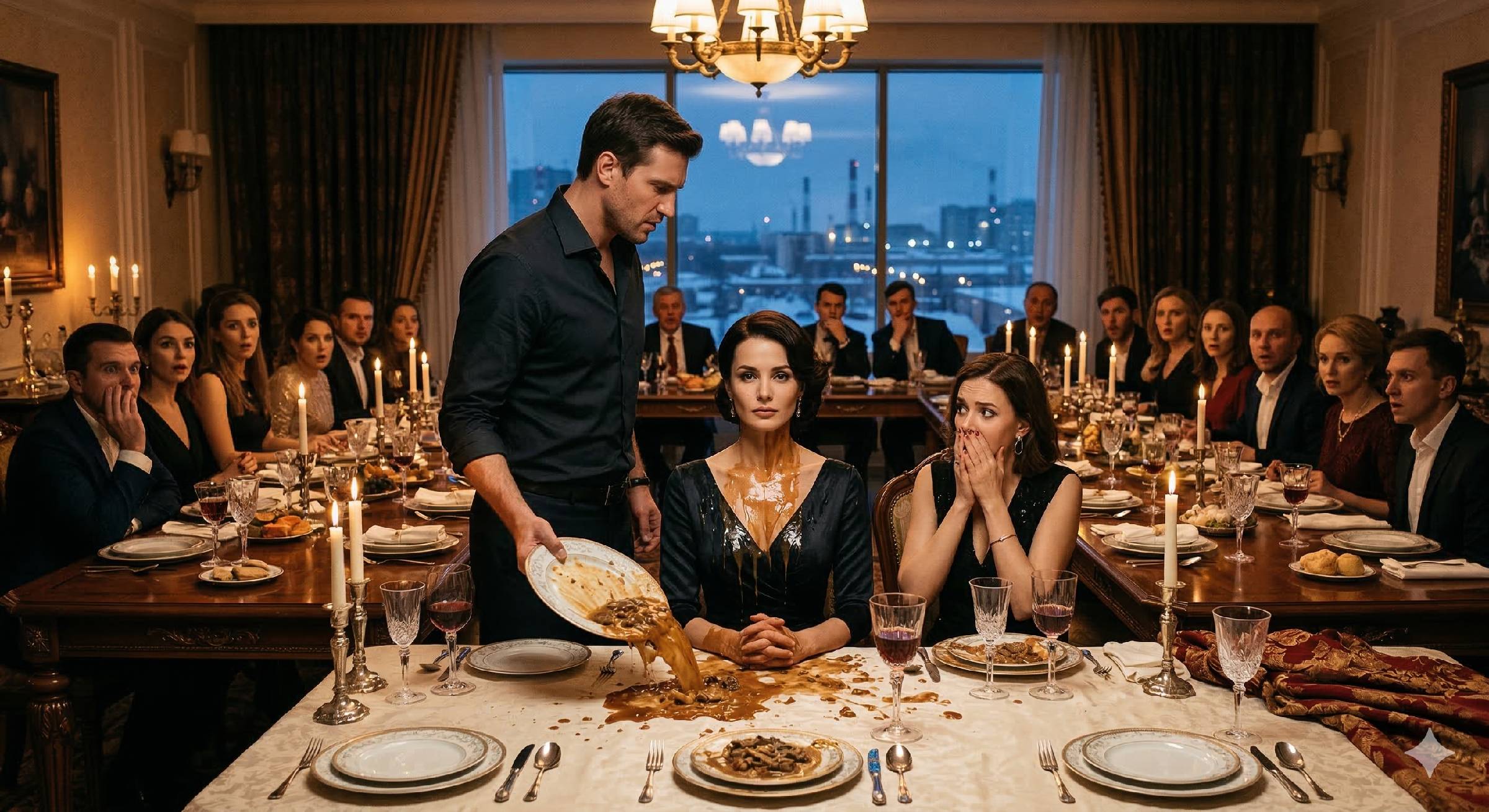 Жирный соус от бефстроганова стекал по моему новому платью, затекая в ложбинку между ключицами. Было горячо и невыносимо липко. Девятнадцать пар глаз — коллеги Павла, его руководство из департамента и их холеные жёны — застыли, как манекены в витрине. В воздухе повис густой запах тушеной говядины и гробовая тишина, которую прерывало только тиканье настенных часов.