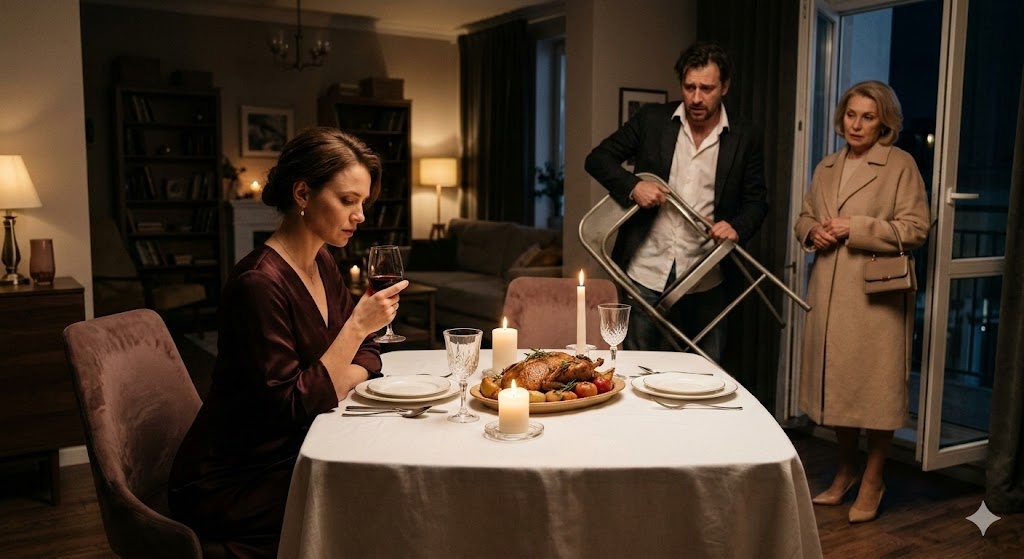 — Раз ты пригласил маму без предупреждения, — произнесла она тихо, чеканя каждое слово, — пожалуйста, сам найди ей стул, достань посуду и организуй место за столом.