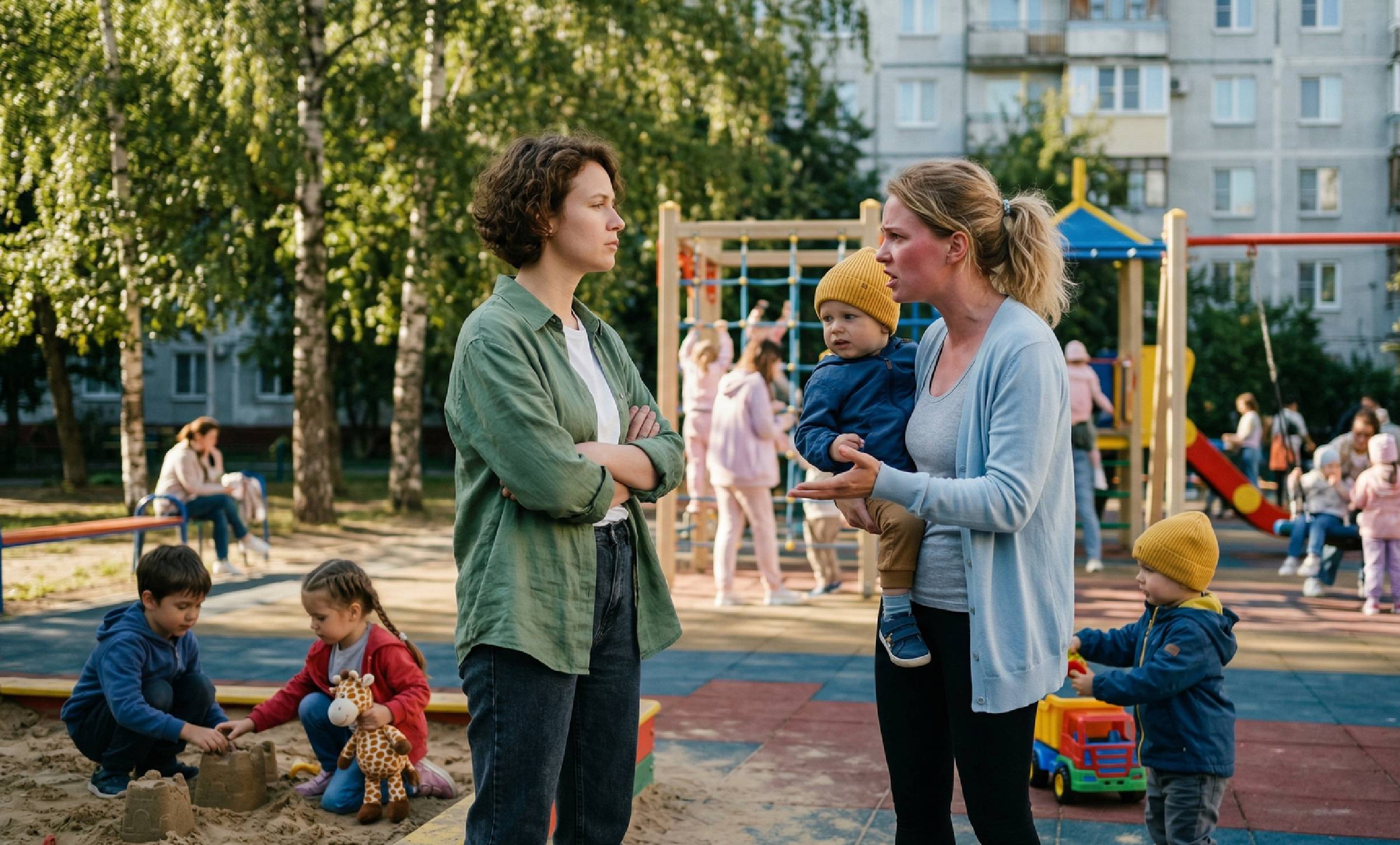 На детской площадке воцарилась странная, почти звенящая тишина, которую нарушал только скрип старых качелей.
