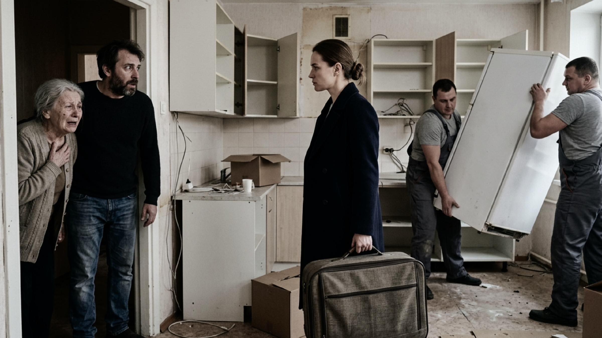 Работа кипела, Полина параллельно собирала свои чемоданы. Вещей оказалось не так много — три чемодана одежды, ноутбук, папки с документами. К половине первого квартира изменилась до неузнаваемости. На месте дорогой встроенной техники зияли чёрные дыры с торчащими проводами. В спальне остался только голый деревянный каркас кровати.